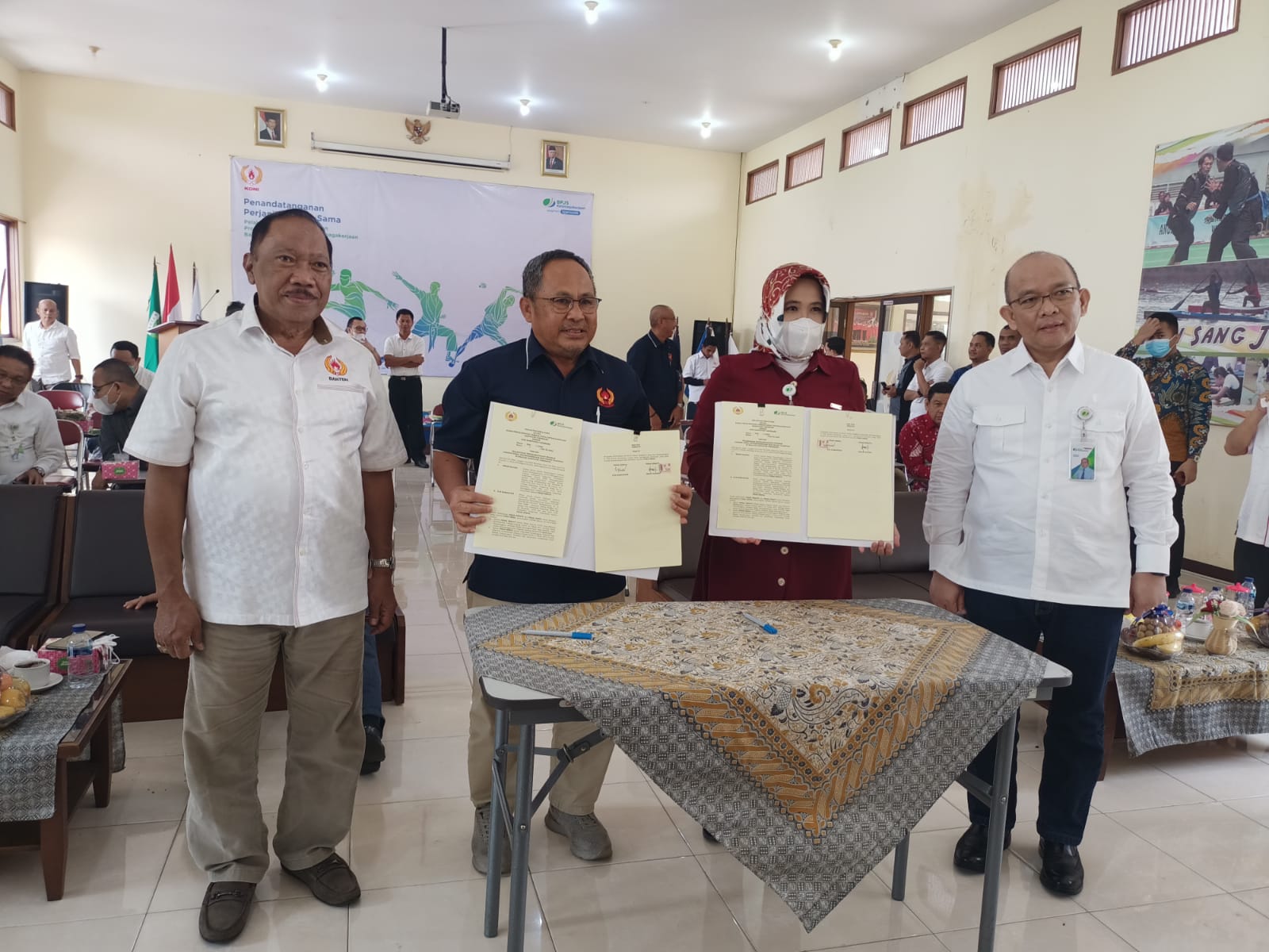 Diketahui dalam penandatanganan perjanjian kerjasama ini dilakukan secara serentak di seluruh Indonesia. Dan hari ini di jajaran KONI Kabupaten/Kota se Provinsi Banten juga melakukan penandatanganan perjanjian kerjasama dengan Kantor Cabang BPJS Ketenagakerjaan se Provinsi Banten.