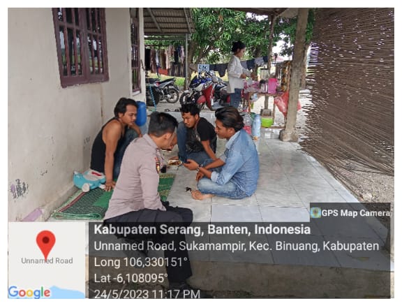 SERANG, (persepsi.co.id) – Bhabinkamtibmas Polsek Carenang Polres Serang Melaksanakan kegiatan Sambang dan kunjungan kepada masyarakat binaanya sebagai upaya promoter mendekatkan diri kepada warga masyarakat dikp. Salak Desa Sukamampir Kec. Binuang Kab. Serang, hari Rabu (24/05/2023) pukul 11.17 WIB.