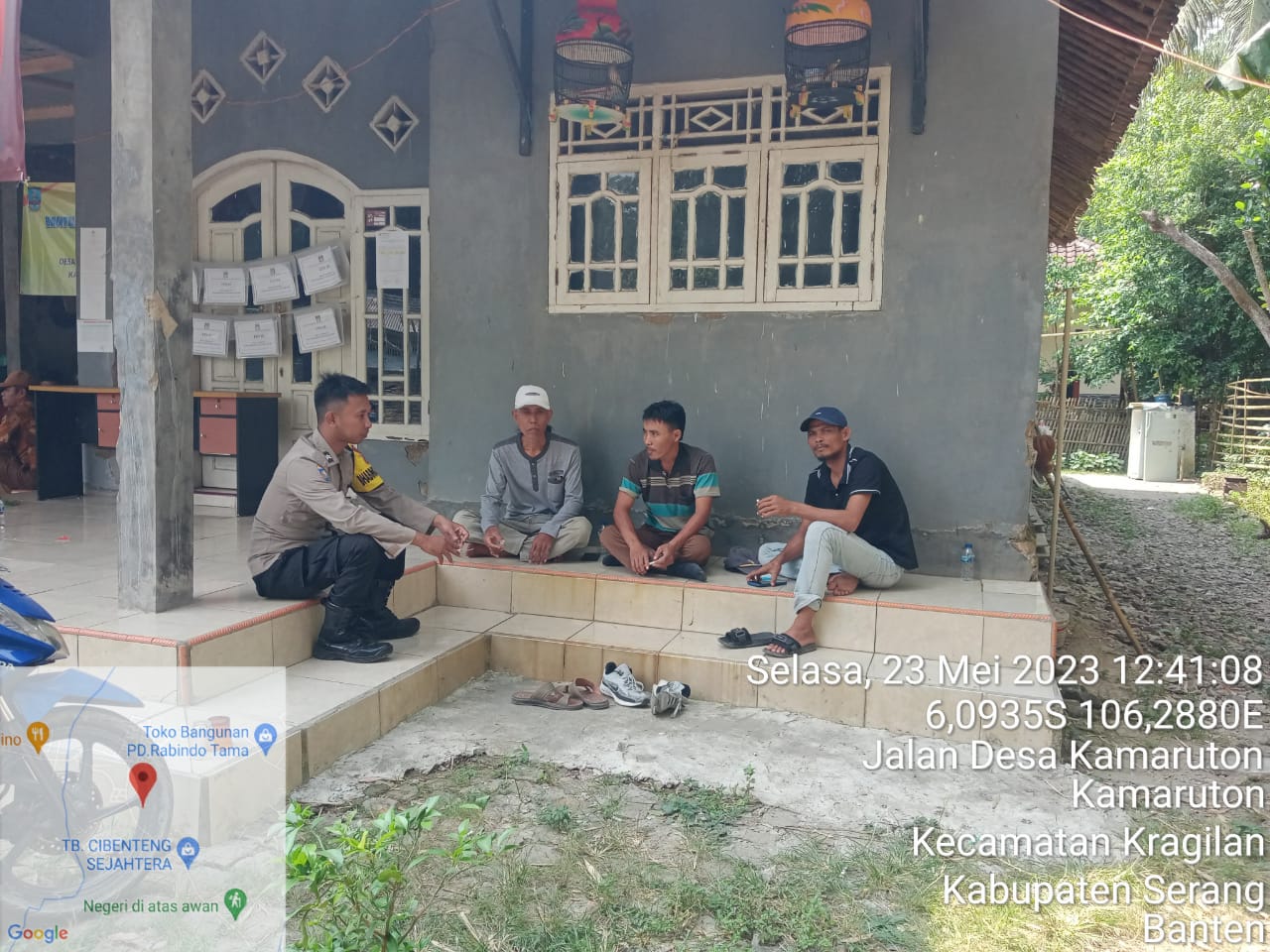 Pontang, (persepsi.co.id) – Bhabinkamtibmas Briptu Robbi Polsek Pontang Polres Serang Ngobras (ngobrol santai) bareng dengan warga desa membahas tentang poskamling didesa yang sudah mulai tak kelihatan lagi masyarakat nya untuk berjaga malam. Yang dilaksanakan pada hari Selasa 23 Mei 2023 pukul 11.20 wib di Desa Kamaruton.