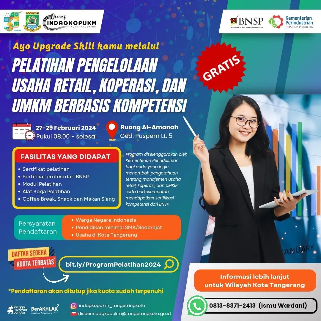 Saat ini, Disperindagkop UKM Kota Tangerang telah membuka proses pendaftaran dengan kuota yang terbatas. Untuk para pelaku usaha yang berminat mendapatkan akses pelatihan tersebut dapat mendaftar diri melalui pranala berikut, bit.ly/ProgramPelatihan2024. Serta, informasi lebih lengkap mengenai pelatihan tersebut dapat menghubungi Isnul Wardani (0813-8371-2413). (*)