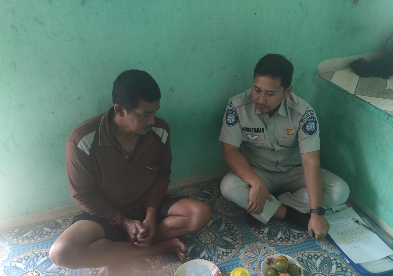 Petugas Jasa Raharja Samsat Cikande, Nurochman mewakili PT Jasa Raharja Cabang Banten tiba di kediaman Ahli Waris korban kecelakaan guna menyampaikan berbela sungkawa serta jemput bola sekaligus mendata kelengkapan berkas untuk penyerahan santunan meninggal dunia yang akan diserahkan kepada ahli waris.