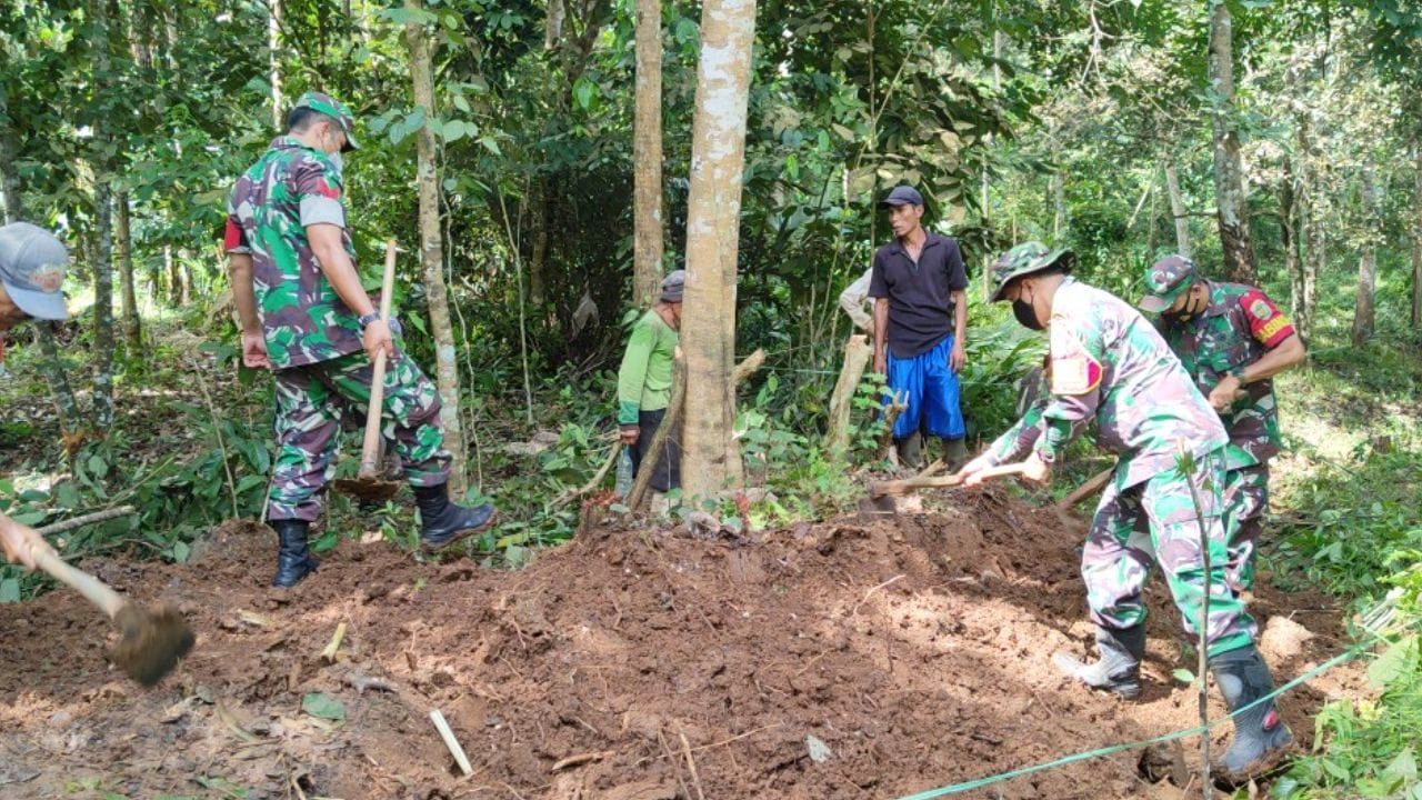 Anggota Koramil 0102/Cadasari Kodim 0601/Pandeglang bersama masyarakat melaksanakan kegiatan Karya Bakti, membuat jalan penghubung yaitu antara Desa Gereundong dengan Desa Cikentrung kurang lebih sepanjang 1,2 Km, bertempat di Kecamatan Koroncong Kabupaten Pandeglang Provinsi Banten, Rabu (09/02/22)
