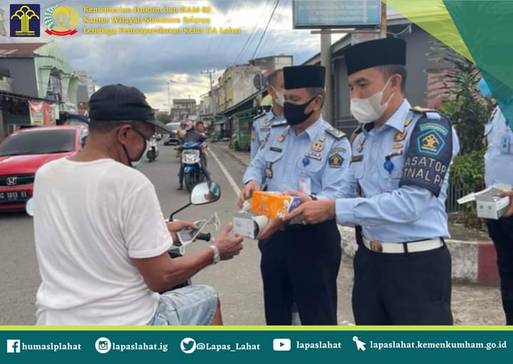 KAB LAHAT – (Persepsi.co.id) Lembaga Pemasyarakatan Kelas IIA Lahat Kantor Wilayah Sumatera Selatan menggelar bakti sosial “Kumham Berbagi” dengan membagikan Takjil dan masker gratis kepada masyarakat umum yang melintas, Didepan Kantor Lapas Kelas IIA Lahat Jalan RE.Martadinata , Kelurahan Pasar Lama, Selasa, 12 April 2022.