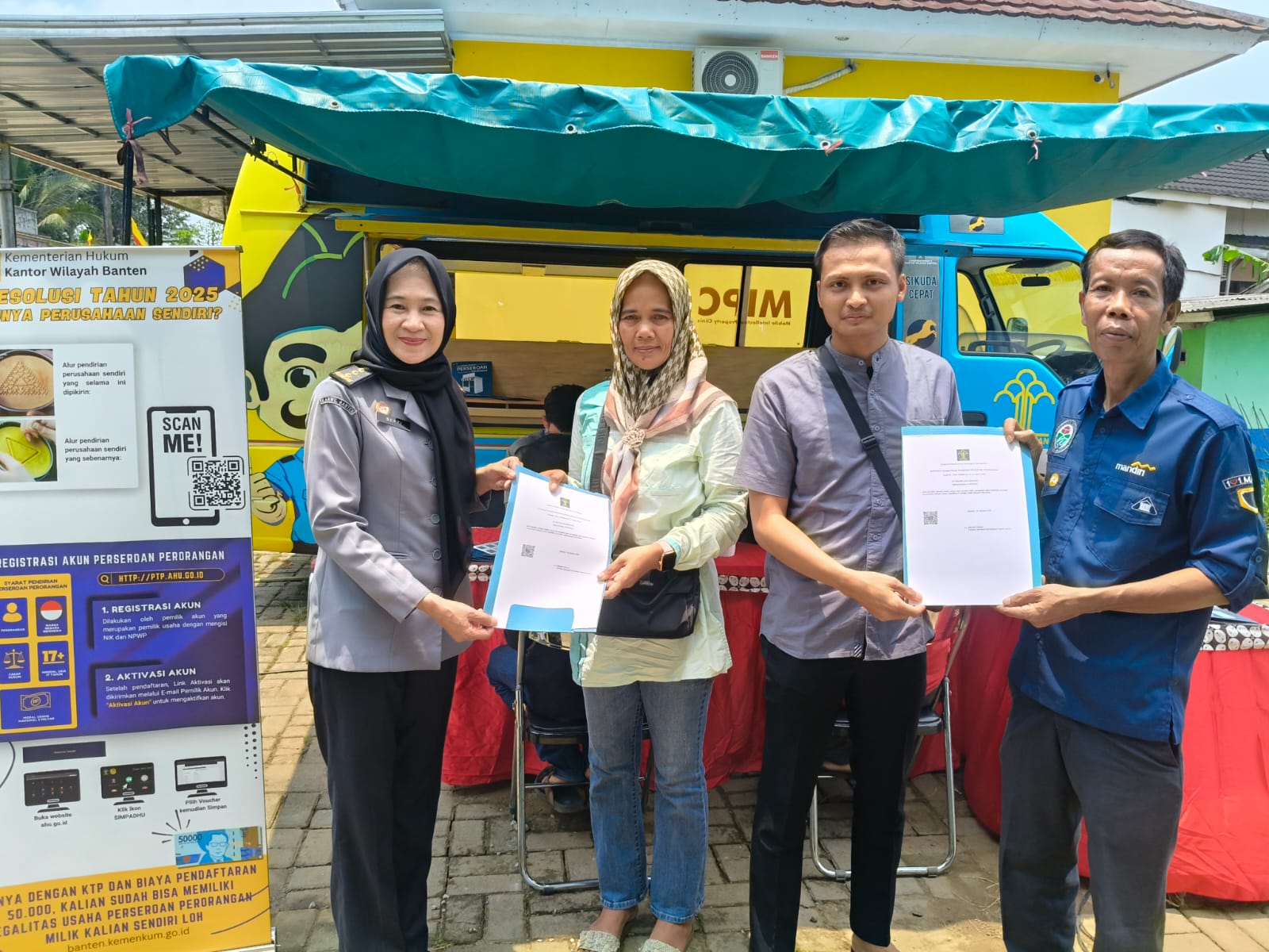 “Saya sangat mengapresiasi layanan dari Kemenkum Banten. Petugasnya datang langsung ke desa, pelayanannya cepat, ramah, dan lugas. Sekarang saya sudah punya sertifikat PT Perseroan Perorangan, jadi usaha kami lebih jelas dan legal,” ujar Edit dengan semangat.