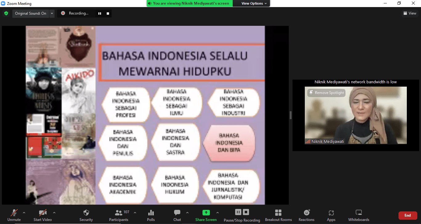 Niknik di sesi pertama menjelaskan tentang prestasi beliau, bagaimana beliau bisa mendirikan Kampung Bahasa Bloombank dan menerangkan peran serta guru dalam mengajar BIPA itu penting di kelas BIPA.