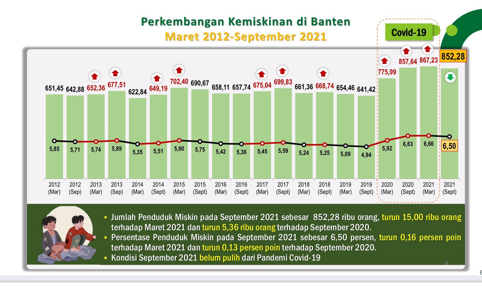Sebagai informasi, berdasarkan Berita Resmi Statistis (BRS) Badan Pusat Statistik (BPS) Provinsi Banten No. 05/01/36/Th. XVI, 17 Januari 2022, persentase penduduk miskin di Provinsi Banten pada September 2021 sebesar 6,50 persen, menurun 0,16 persen poin terhadap Maret 2021 dan juga menurun 0,13 persen poin terhadap September 2020. Jumlah penduduk miskin pada September 2021 sebesar 852,28 ribu orang, menurun 15,00 ribu orang terhadap Maret 2021 dan menurun 5,36 ribu orang terhadap September 2020.