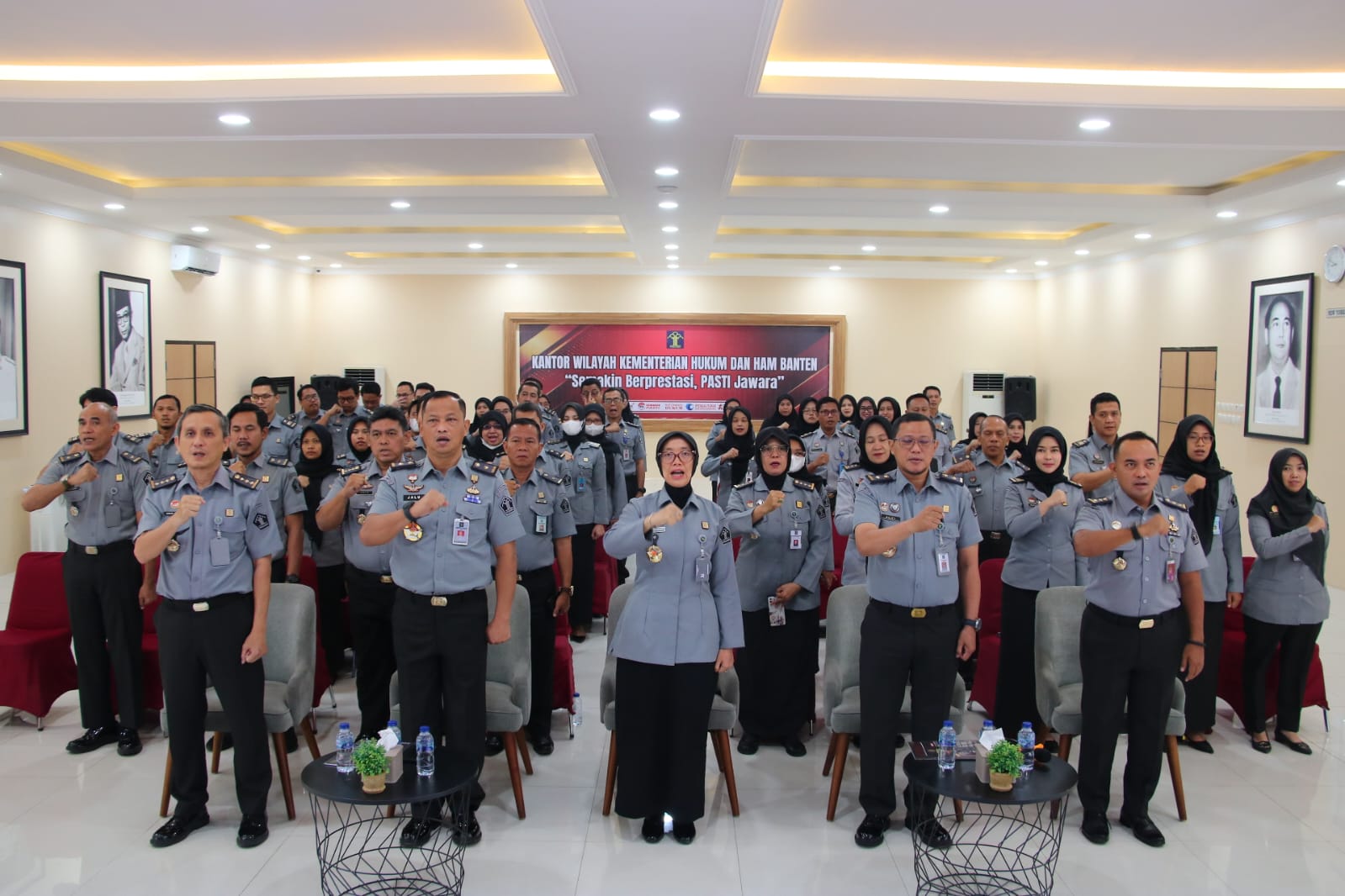 Dilakukan secara hybrid, luring di Graha Pengayoman dan virtual melalui aplikasi Zoom Meeting oleh Satuan Kerja Kemenkumham di seluruh Indonesia, turut mengikuti dari Bale Soepomo Kantor Wilayah Kemenkumham Banten, Pimpinan Tinggi Pratama, Administrator, Pengawas, JFT/Pelaksana dan PPNPN.