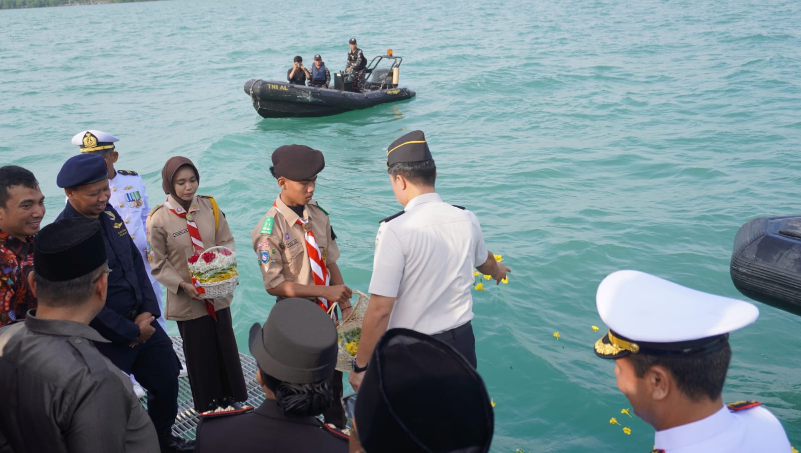 Dari pantauan, terlihat upacara tabur bunga di tengah laut berlangsung penuh hikmad. Upacara diawali dengan penghormatan kepada arwah pahlawan, dilanjutkan dengan mengheningkan cipta, serta pelarungan karangan bunga ke laut sebagai simbol doa dan penghormatan bagi para pahlawan samudera.
