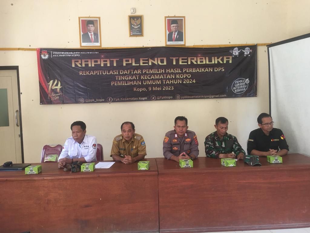 Kegiatan tersebut dihadiri oleh Camat Kopo Tenda Subekti, M.Si, Anggota Koramil Kopo Serma Cece, Kanit Intelkam Polsek Kopo Bripka Khabib, Panwas Kecamatan Kopo, Ketua PPK Kopo, Ketua PPS Se – Kecamatan Kopo.