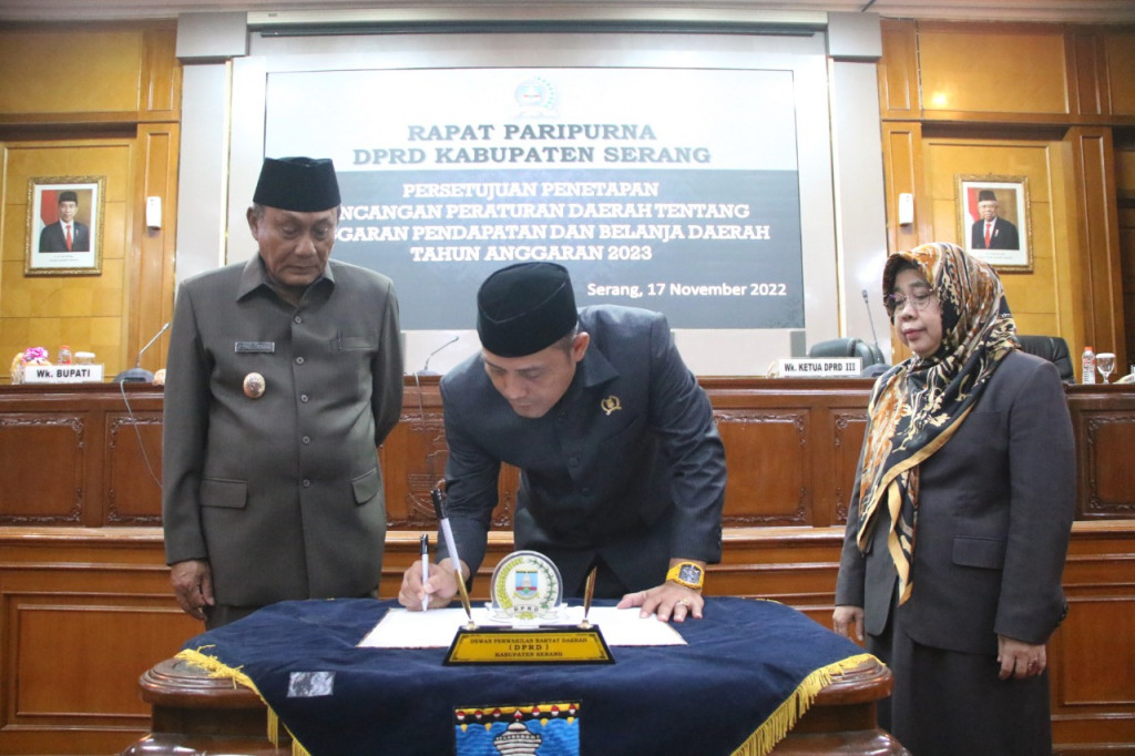 Rapat Paripurna DPRD Kabupaten Serang Persetujuan Penetapan Rancangan Peraturan Daerah tentang Anggaran Pendapatan Belanja Daerah Tahun 2023 di pimpin oleh Ketua DPRD Bahrul Ulum. Turut hadir puluhan anggota dewan, Sekretaris Daerah (Sekda) Tubagus Entus Mahmud Sahiri dan para kepala OPD di lingkungan Pemkab Serang.(*)