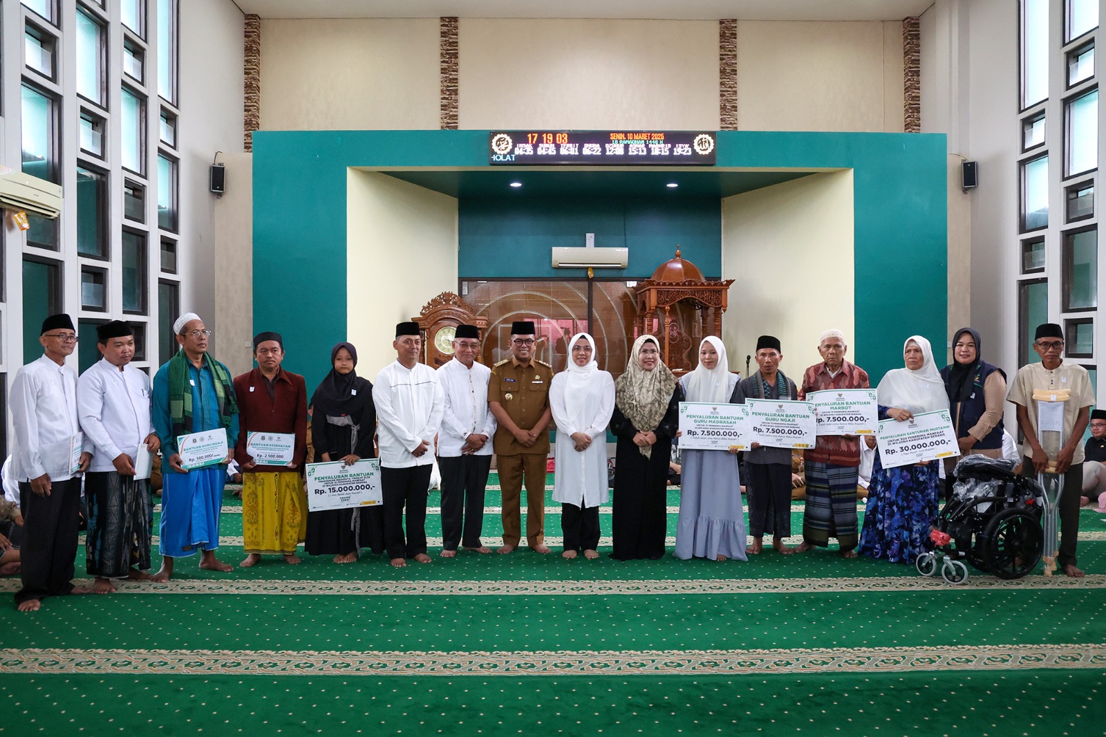 Kemudian bantuan untuk Marbot masjid dan santunan kepada 300 dhuafa, alat bantu jalan sampai kursi roda.