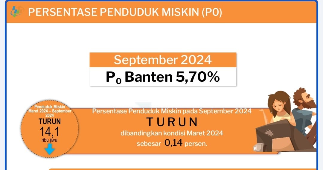Banten, (persepsi.co.id) – Berdasarkan Berita Resmi Statistik Badan Pusat Statistik Provinsi Banten Nomor 05/01/36/Teh.XIX, 15 Januari 2025, persentase penduduk miskin Provinsi Banten turun. Dibanding periode Maret 2024 yang 5,84 persen, turun 0,14 persen menjadi 5,7%pada periode September 2024.