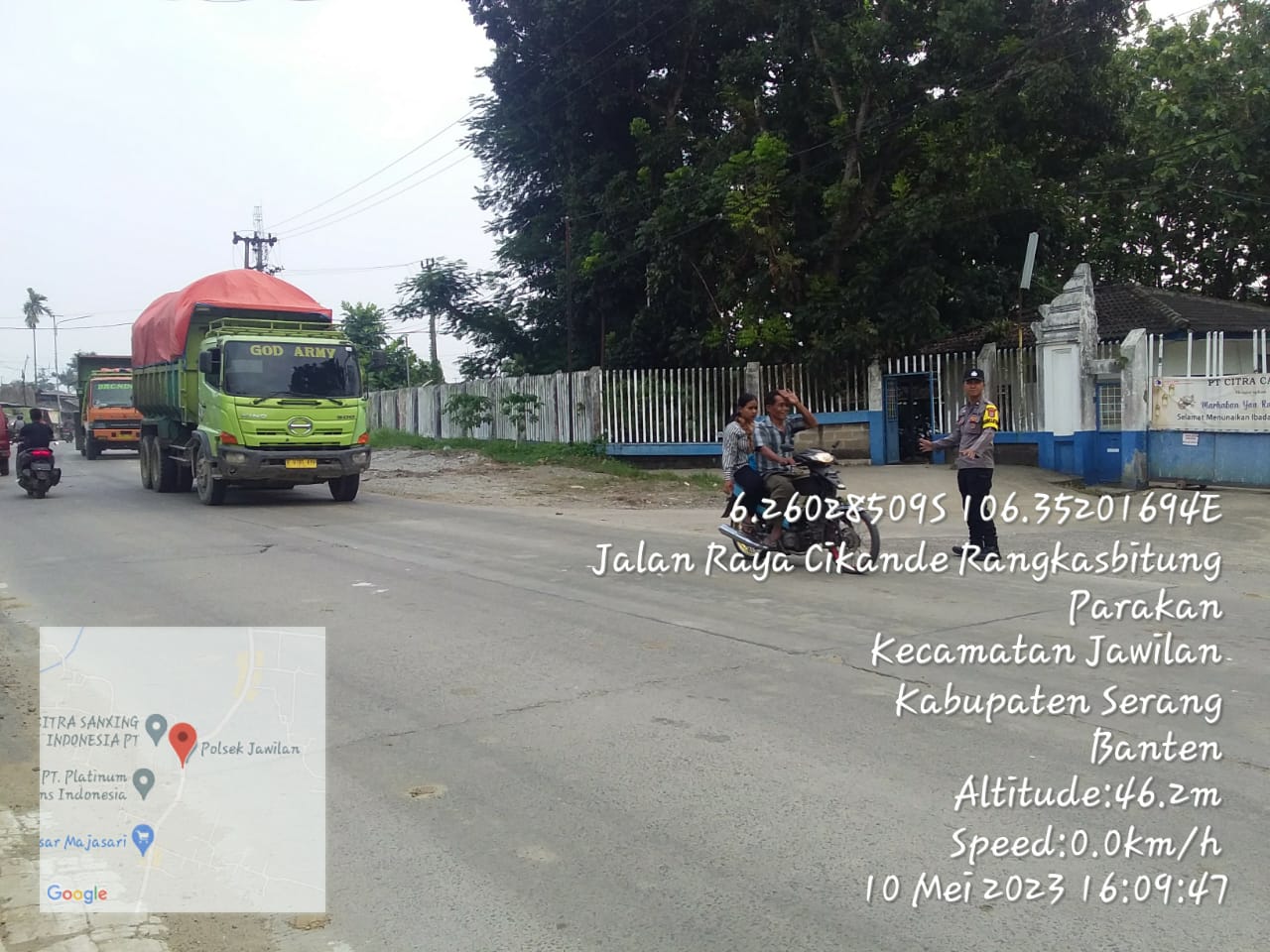 SERANG, (persepsi.co.id) – Bhabinkamtibmas Polsek Jawilan Polres Serang Bripka Jaenal dan Briptu Hartanto melaksanakan giat strong poin sore di Jalan Raya Cikande Rangkasbitung depan PT.Citra Mahasurya Industries Desa Majasari, Kecamatan Jawilan, Rabu (10/5/2023) Sore.