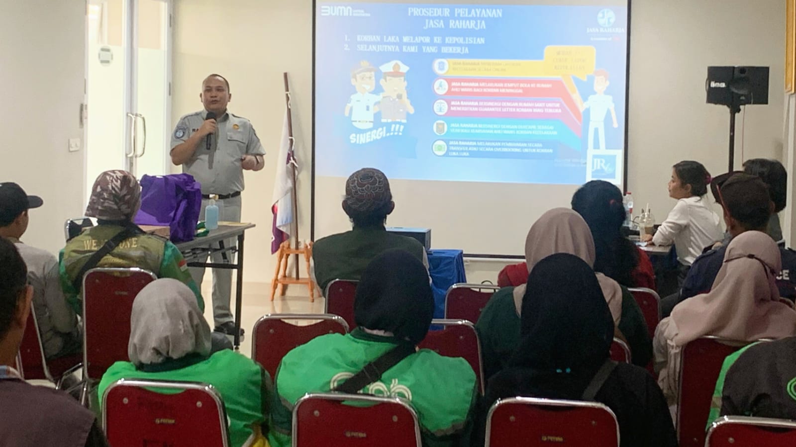 Selaku narasumber mewakili Jasa Raharja Perwakilan Tangerang kegiatan sosialisasi ini disampaikan oleh Staff Administrasi Samsat Gerai Bintaro Rama Adhitya Budhiarto dan dr. Silvia Margaretha, Sp.OT, lalu dihadiri oleh peserta yang merupakan komunitas ojek online dan komunitas ambulance.