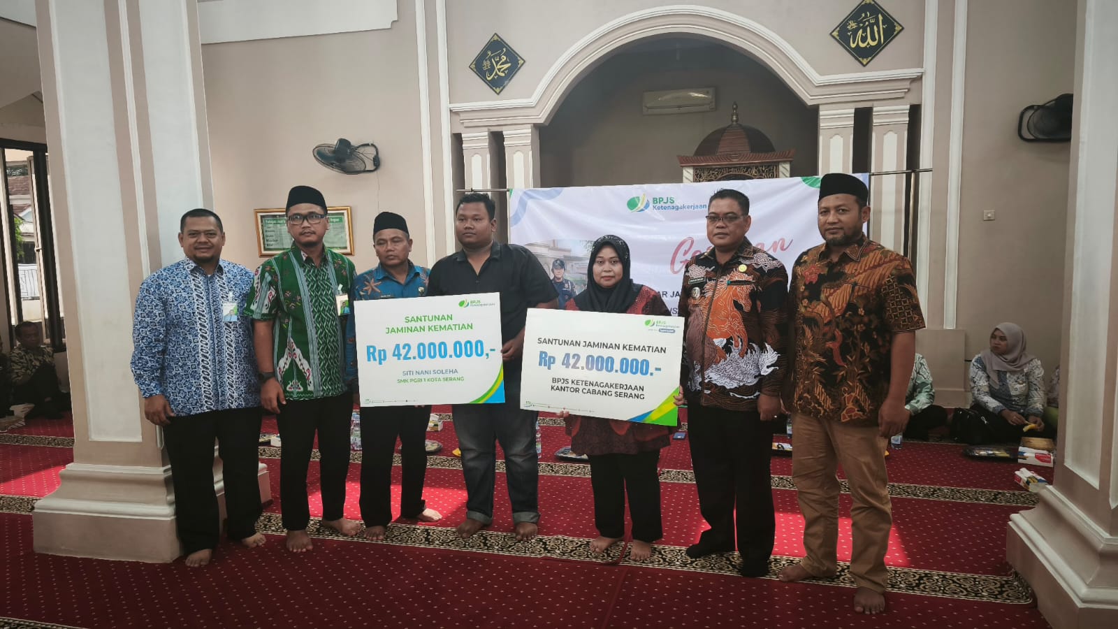 Adapun penyerahan manfaat program JKM BPJS Ketenagakerjaan tersebut diserahkan langsung oleh Kepala BPJS Ketenagakerjaan Cabang Serang Uus Supriyadi bersama Camat Walantaka Muslim Soleh pada acara gerakan sadar jaminan sosial ketenagakerjaan di Masjid Baitul Mukmin, Kp Kemanggisan, Kel Pabuaran, Kec Walantaka, Kota Serang. Kamis, 23 April 2026.